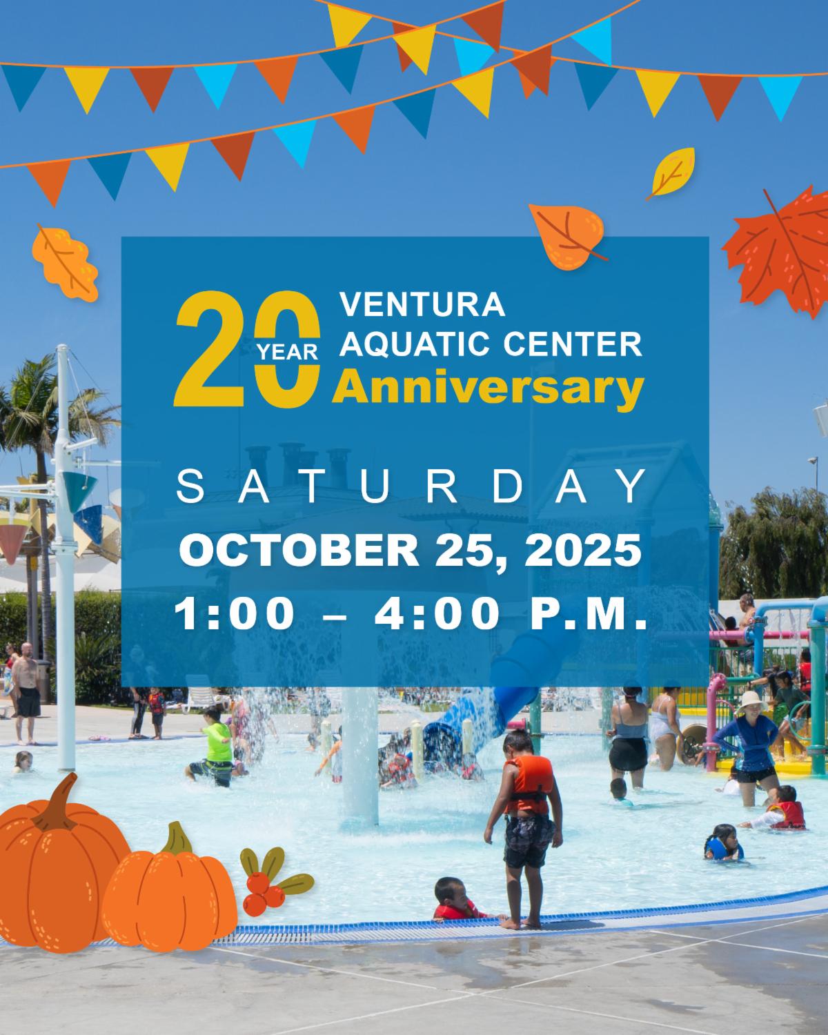 Ventura, Calif. – Dive into fun at the Ventura Aquatic Center’s 20th Anniversary Celebration on Saturday, October 25, 2025, from 1:00 to 4:00 p.m. Entry is free!